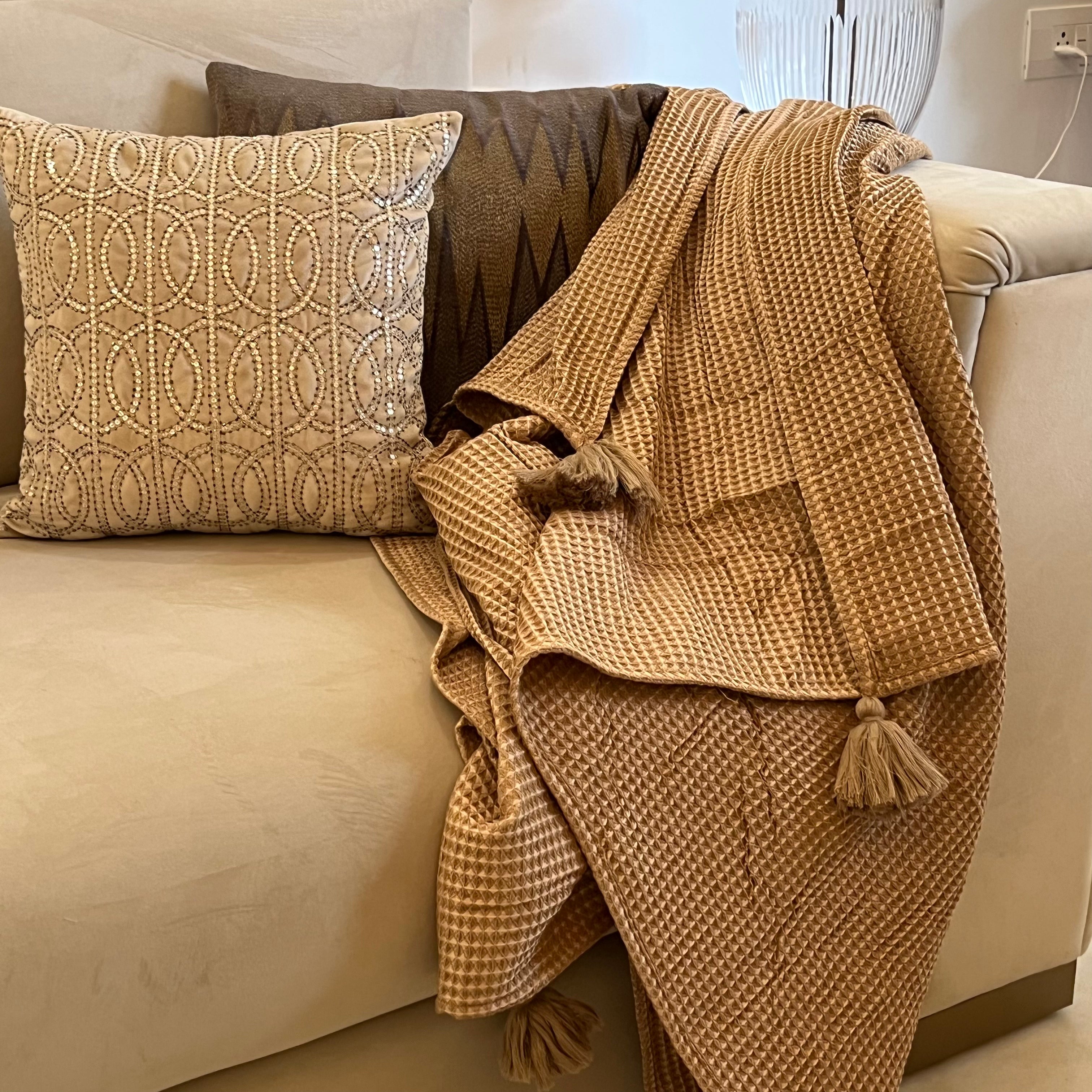 Mocha Honeycomb Woven Throw with Embroidered Cushion Cover 16"x16" (2pc Set)